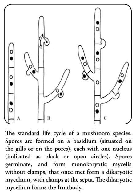 For many species we do not know the details of this life cycle; it is not too hard to count nuclei in the cells of a fruitbody, but mycelium is harder to find, and in many cases hard to grow. And, what it actually means when there are two (or three or ten) nuclei in a stipe cell is another issue.