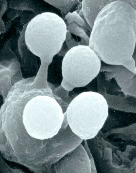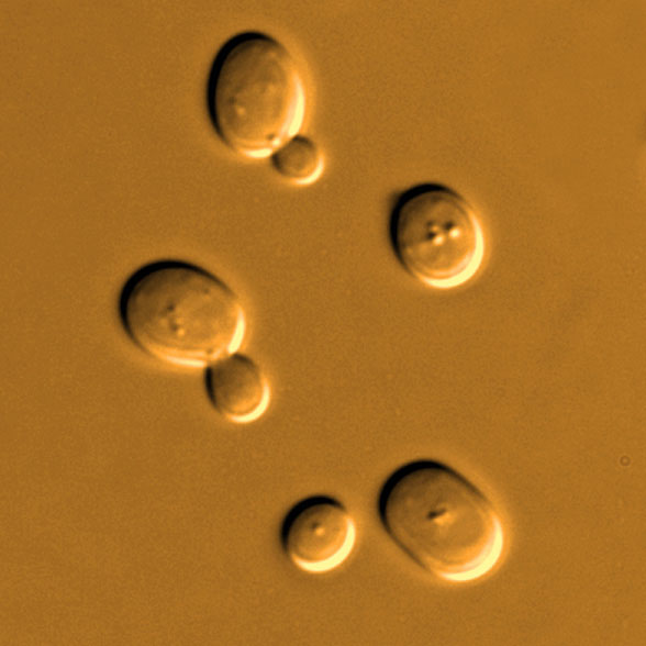 Fig. 1. Yeast cells (Saccharomyces cerevisiae). The two cells on the left are budding, and making new yeast cells.