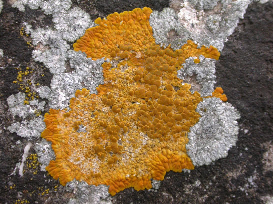 (France). The flat round objects in the middle are the fruitbodies of the fungus, but the rest of the organism is visible as well (in non-lichenized fungi, that part is invisible to the naked eye and is hidden in soil, etc.). (photo by the author)