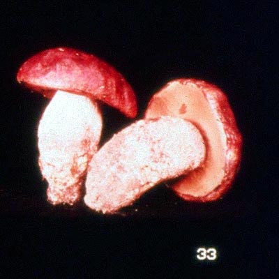 Pileus 8-15 cm latus, convexus vel plano-convexus, siccus interdum viscidus aetate, appresso-fibrillosus vel fibrilloso-squamosus margine, disco tomentosus vel velutinus, obscure rufus. Contextus albus tactu fuscus. Tubuli 1-2 cm longi, fusco-olivacei; pori fumoso-brunnei. Stipes 10-12 cm longus, 1.5-3.5 cm latus, siccus, albus, squamis confertis, fuscis, parvulis. Sporae 13.3-17.1 X 4-6 µm, subcylindricae vel subellipsoideae. Cuticula intertexta, globulis pigmenti (in Melzer's). Holotypus (no. 28531) a David Largent lectus prope Eureka, Humboldt County, October 30, 1971; in Herbarium San Francisco State University conservatus.