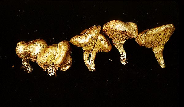 Tubes up to 1.5 cm in length, bluntly adnate when young, becoming arcuate-decurrent to decurrent with age; when young deep yellow ("mustard yellow" to "amber yellow"), changing to dark yellow ("antimony yellow" to "yellow ocher") with age, sometimes becoming brownish with age, unchanging upon exposure; pores up to 4 mm in length, 3 mm in width, distinctly compound, concolorous with tubes, unchanging when bruised.