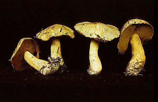 Observations This very distinctive Suillus is distinguished by the strongly developed, fibrillose-scaly surface of the pileus, the bluing of the context upon exposure, and the absence of a veil or annulus. Although the fibrillose scales are grayish to olivaceous when young, they frequently become red to bright red with age, at least in regions where the temperature becomes relatively low at night, such as the Sierra Nevada and other mountain ranges. Because of this color change, it is sometimes misidentified as S. americanus, but its larger size and the blue discoloration of the context make it readily distinct. Suillus tomentosus can be distinguished from other Suillus species having a fibrillose-scaly cuticle, such as S. fuscotomentosus and S. californicus, by the much paler color of the fibrils and the color changes in the context. It is distinguished from the species in which the context changes to blue, such as S. caerulescens, S. ponderosus, and S. reticulatus, by the fibrillose-scaly cuticle, the absence of a veil, and the lack of reticulations on the surface of the stipe.